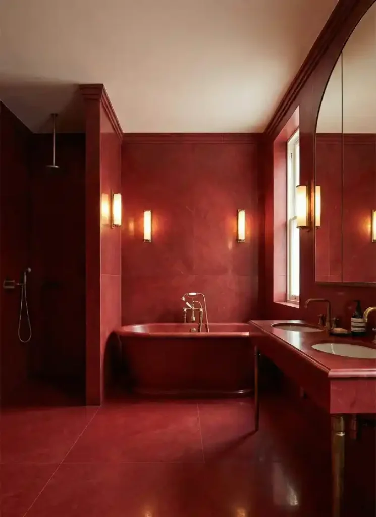 Monochromatic Depth: Using the same red tone on walls, cabinetry, and the bathtub creates a unified, expansive visual effect that blurs the room’s boundaries.