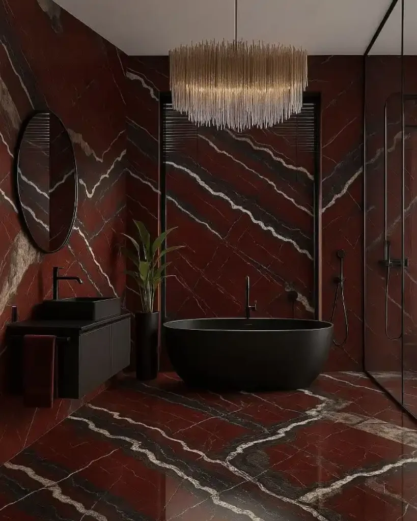 7. Crimson Matte & Midnight Marble Sanctuary – A Bold Twist on Red Luxury