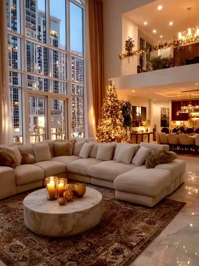 5. Golden Twilight and Cream Velvet Penthouse – Mansion Living Room Elegance with a Festive Glow