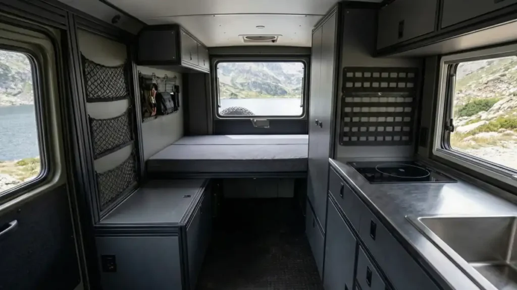 Stepping inside feels less like entering a camper and more like boarding a futuristic mobile command center designed for long-term independence. Brushed aluminum cabinetry pairs seamlessly with the matte grey walls, creating a clean, industrial aesthetic that prioritizes durability over decorative frills.