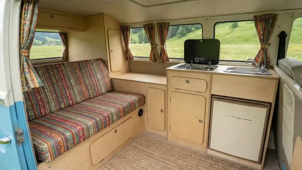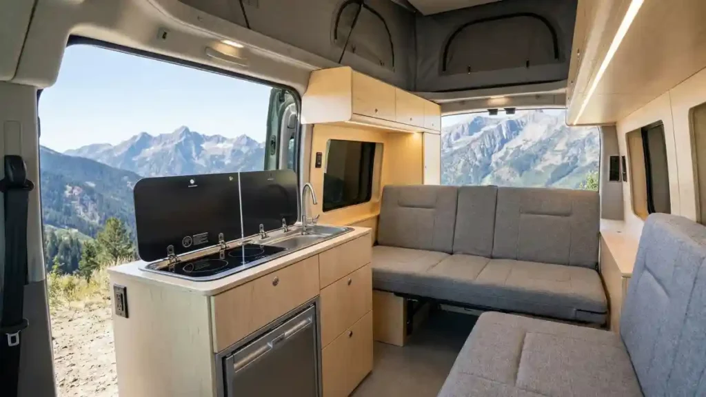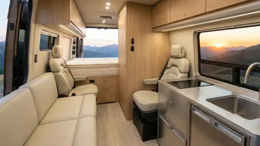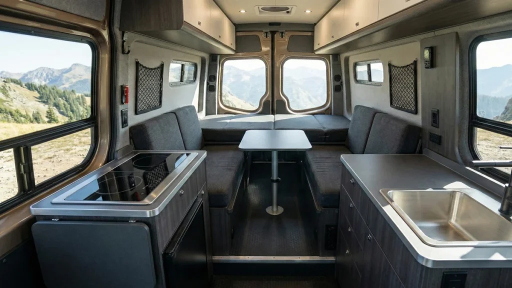 Turning the front seats around opens up the floor plan, allowing for a comfortable dining or work setup right in the cab. It proves that van life can be as comfortable as a stationary home.