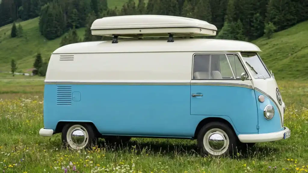 That sky-blue and cloud-white paint job isn’t just about retro style; it masks a thoroughly modern electric powertrain that keeps the air as clean as the meadows you park in.