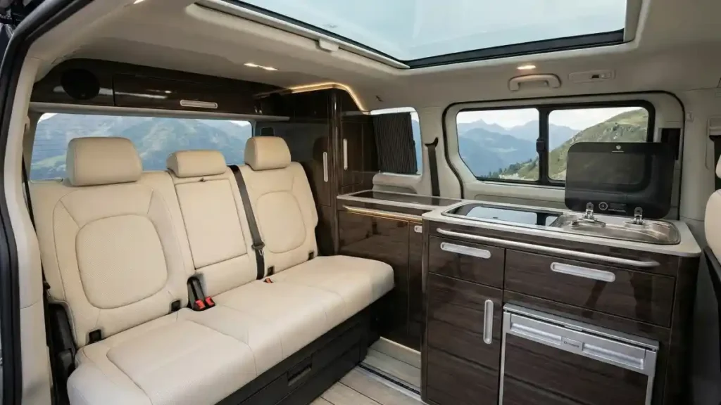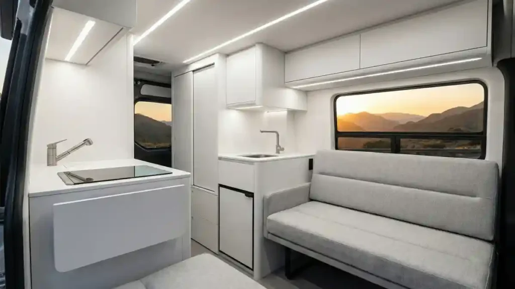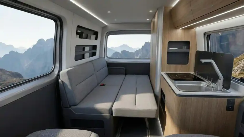 When night falls, the bench seating quickly transforms into a comfortable sleeping area, lit by warm, efficient LED strips that run along the ceiling. It proves eco-friendly travel can be incredibly stylish.