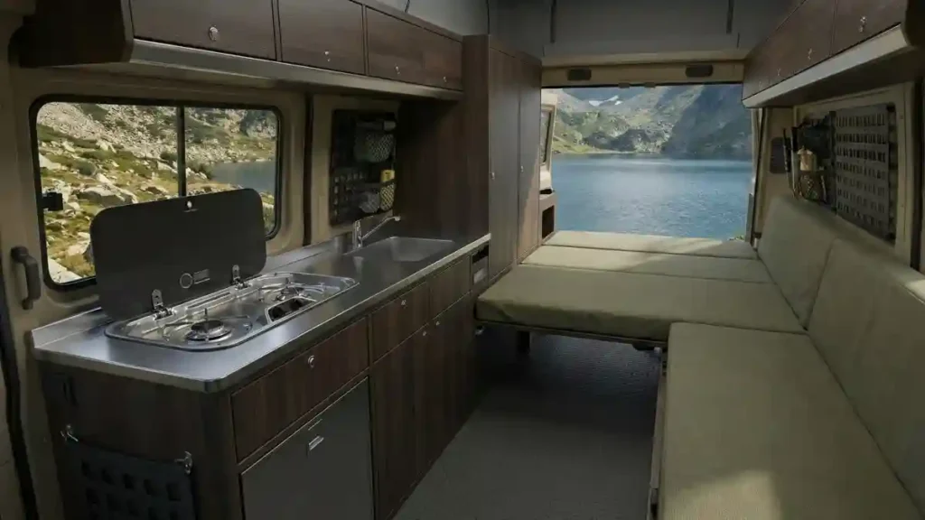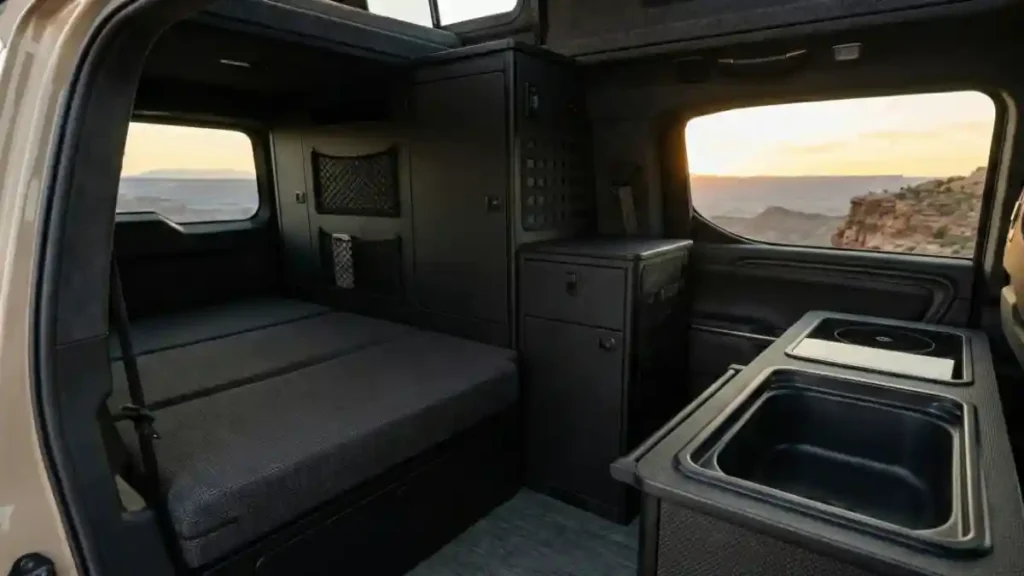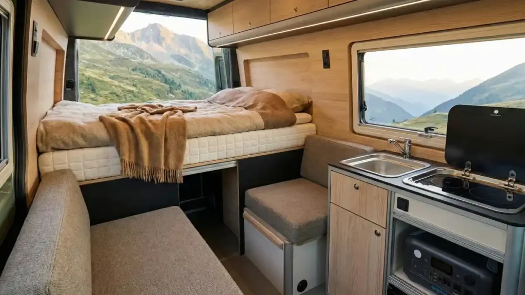 - Elevated Bed Platform: Maximizes “garage” storage underneath for large batteries and water tanks.