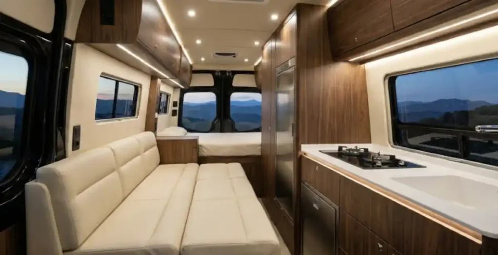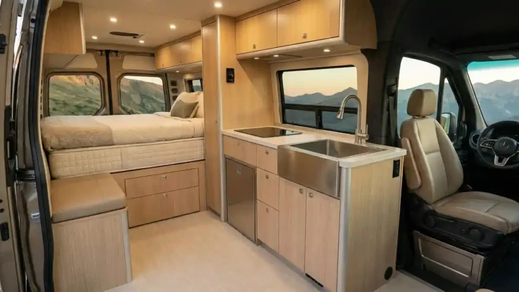 Light wood cabinetry wraps around the interior, creating a warm and inviting sanctuary that feels surprisingly spacious for a vehicle.