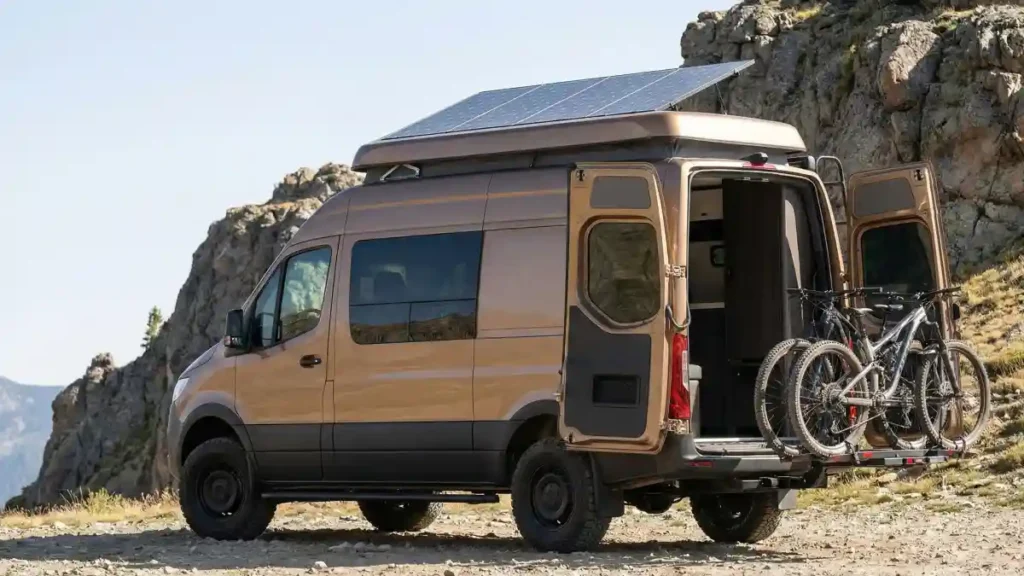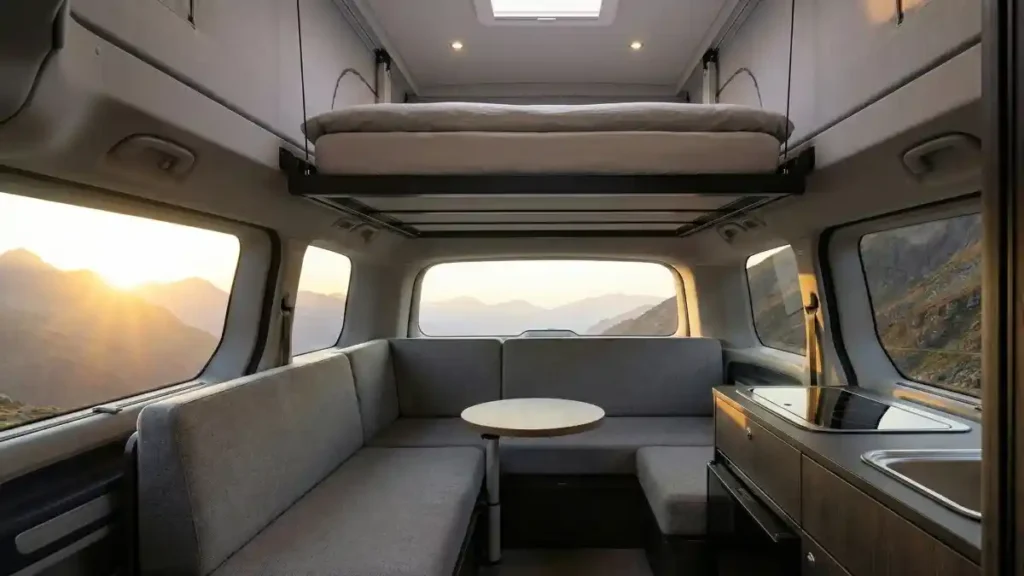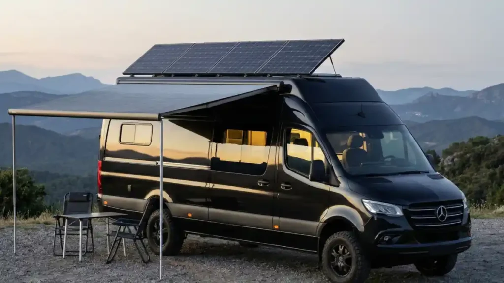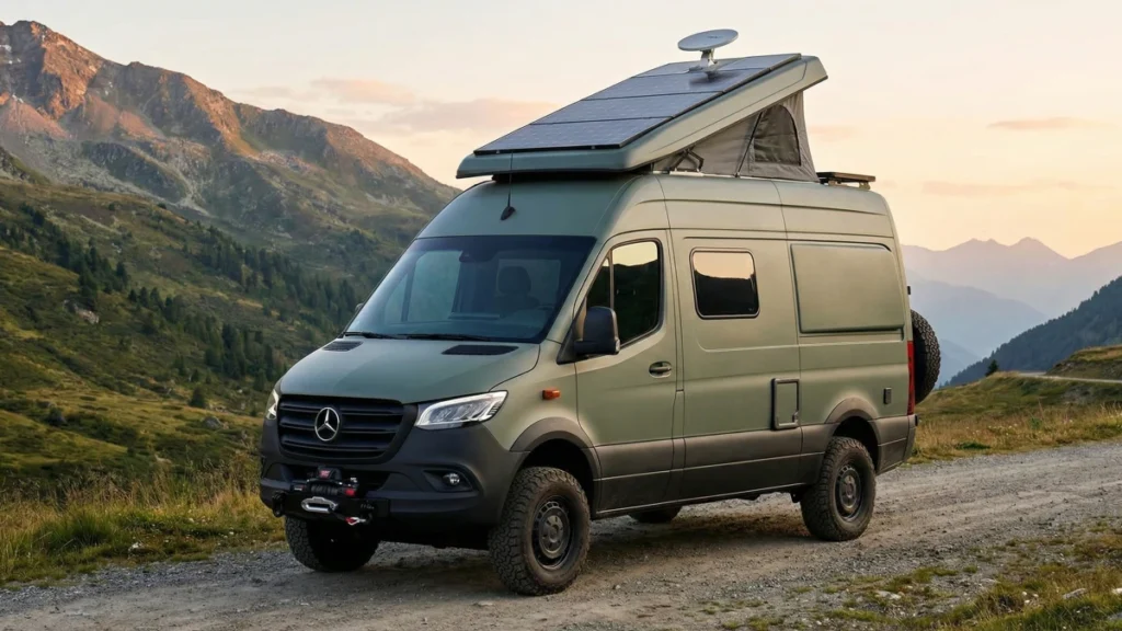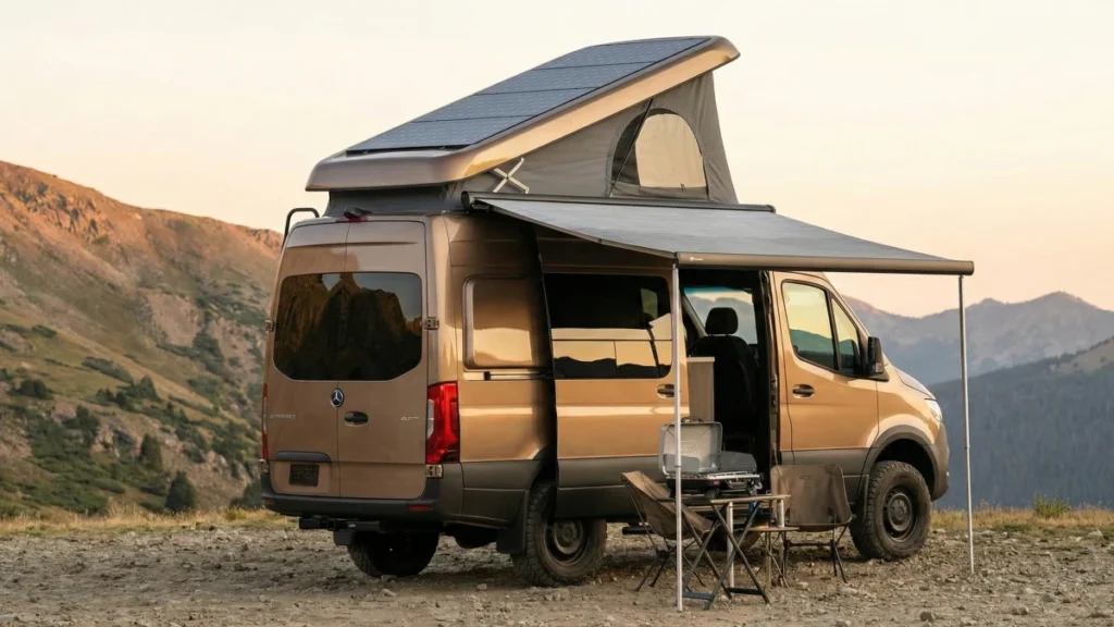- Key Feature: Pop-up roof with integrated solar panels for off-grid power.