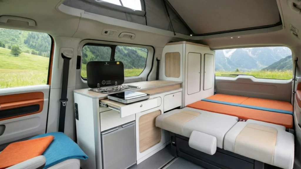 Cooking is handled by a compact induction cooktop that slides out or sits on the counter, maximizing space for the fixed rear bed that promises a good night’s sleep without setup.